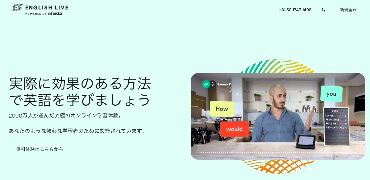 EFイングリッシュライブ | 10,900円〜 | マンツーマン8回/グループ30回 | マンツーマン20分/グループ45分 | 24時間 | 24時間前(グループ不要) | 24時間前 | https://englishlive.ef.com/ja-jp/ |